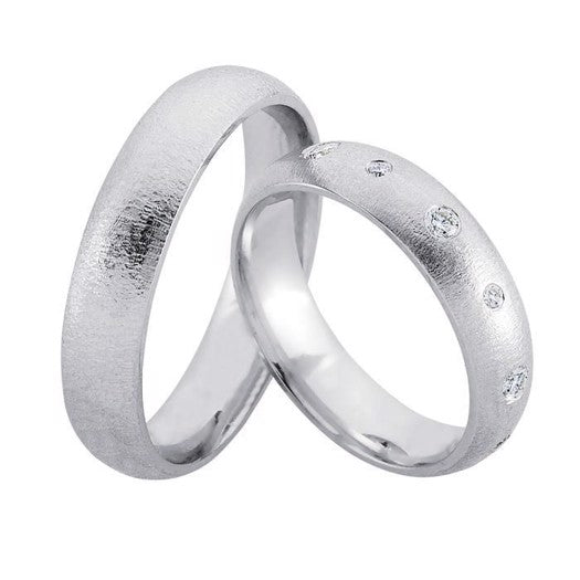 Vielsesringene er udført i rhodineret sterling sølv, hvilket tilfører dem en spejlblank og holdbar finish. Det rustikke overfladedesign giver et moderne udtryk, som gør ringene bemærkelsesværdige uden at gå på kompromis med det klassisk tidløse. Dameringen er udsmykket med i alt 12 brillantslebne diamanter – 6 små á 0,01 ct. samt 6 lidt større á 0,03 ct. (w/vs) – som elegant bryder lyset og tilfører et eksklusivt, feminint præg. Med en ringskinne på 5 mm får du både fylde og komfort, når ringen bæres hver dag. Rhodineringen beskytter samtidig sølvet, så den forbliver blank og modstandsdygtig mod ridser og misfarvning gennem årene. Her får I vielsesringe, der er både behagelige, holdbare og fyldt med personlighed – perfekte for brudepar, der ønsker et design med kant og varige minder.