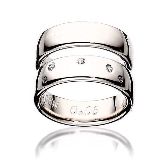Vielsesringene er lavet i eksklusivt 14 karat hvidguld med en blank finish for et moderne, rent udtryk. Den let buede profil sikrer ikke kun komfort, men giver også ringene et elegant udseende, der gør dem tidløse og stilfulde til enhver anledning. Dameringen fremhæver et poetisk touch med fem hvidglitrende diamanter, i alt 0,06 ct. i Wesselton/si-kvalitet, sat som vædderens stjernebillede—et smukt og betydningsfuldt detaljearbejde. Herreringen forener det maskuline og klassiske med sit stenløse design, som matcher dameringen perfekt og skaber balance.