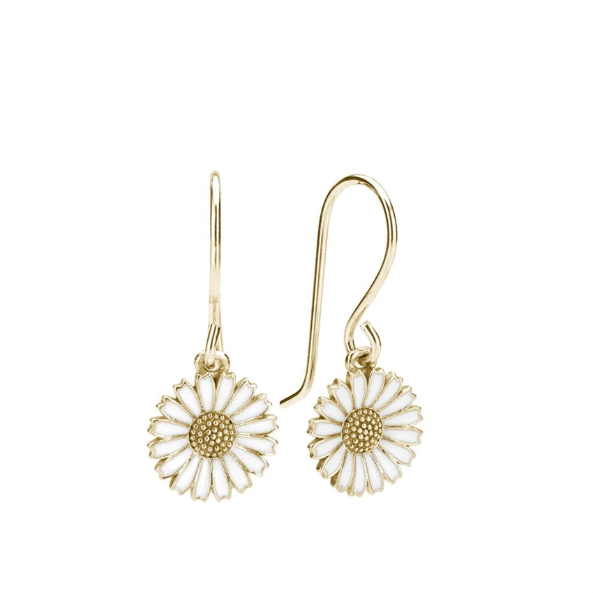 Marguerit ørehængere i forgyldt sølv med hvid emalje fra Kranz & Ziegler, 10 mm