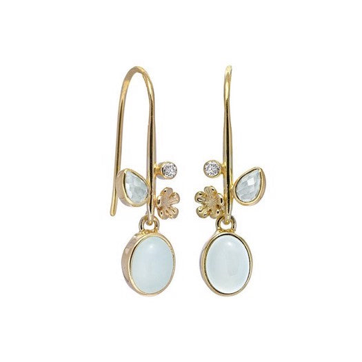 Forest Lake ørehængerne fra Rabinovich er udført i eksklusivt forgyldt sølv, der giver det varme glød til det elegante design. Centralt i smykket sidder en dråbeformet blå calcedon (8x6 mm), der fanger lyset med sit blide udtryk. På hver side prydes øreringen af en dråbeformet hydro aquamarin (3x5 mm), en klar hvid topas (2 mm) samt en lille, sirlig sølvblomst, som fuldender helhedsindtrykket med sit organiske touch. Kombinationen af ædelstenenes diskrete farver og de fine detaljer gør dette design til et tidløst valg, der komplimenterer både en stilren hverdag og festlige anledninger. Ørehængernes lette og harmoniske linjer gør dem ideelle til kvinder, som sætter pris på et poetisk smykke med naturens inspiration – uanset om du vil forkæle dig selv eller give en særlig gave.