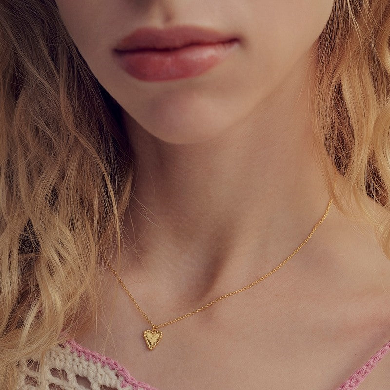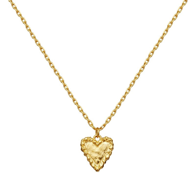 Fatale halskæden er udført i smukt forgyldt sterlingsølv og prydes af et fint hjertevedhæng på 10 mm. Hjertet har en let hamret overflade, der fanger lyset og skaber et varmt, organisk udtryk. Langs kanten sidder små kugler, som tilføjer en blid, feminin detalje. Smykket balancerer elegant mellem romantik og moderne flair og er oplagt til både hverdagsbrug og særlige øjeblikke. Fatale halskæden passer perfekt til dig, der ønsker et personligt smykke med dyb mening – hvad enten det bruges som kærlighedserklæring eller et symbol på styrke, håb og passion.
