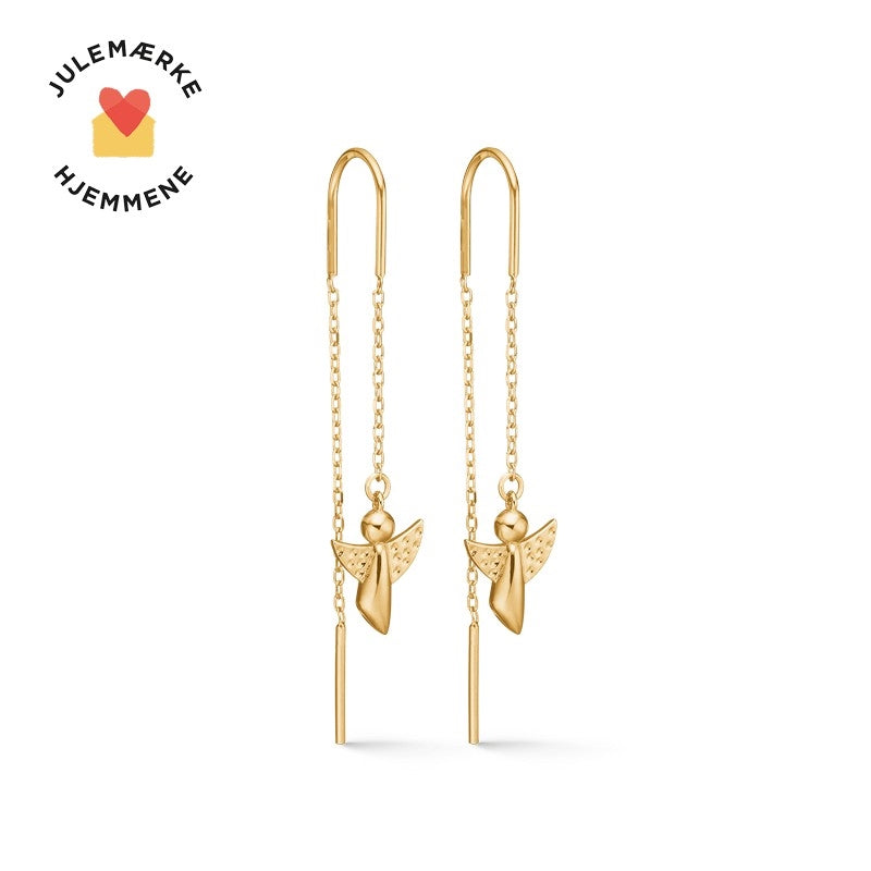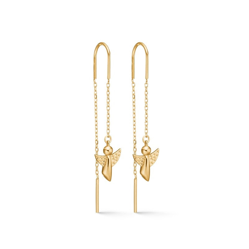 Disse øreringe er fremstillet i 18 karat forgyldt 925 sterlingsølv og måler 32 mm i længden. Hver ørering bærer en yndefuld englesilhuet, der svæver let for enden af din bevægelse. Det fine kædeled giver et legende og feminint udtryk, og kombinationen af det gyldne metal og det enkle, skandinaviske formsprog gør dem både tidløse og moderne. Serien Me & My Angel fra Mads Z hylder omsorg og håb, og med den elegante symbolik passer øreringene til alle, der ønsker et smykke med personlig betydning. Brug dem alene som et poetisk statement, eller kombiner dem med andre smykker for et helt personligt look – uanset om det er til hverdag eller festlige begivenheder.