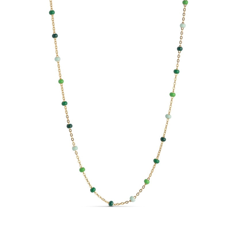 Lola SPRING halskæden fås i varianten forgyldt sølv med farvede emaljeperler i grønne nuancer. Den justerbare længde betyder, at du kan tilpasse halskæden, så den passer præcis til din stil og ønsker.