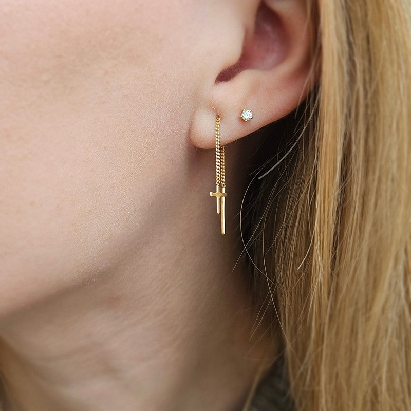 Øreringene fra Smykkecenter er udført i 8 karat guld og prydes af en fin kæde, der trækkes igennem øret for et let og levende udtryk. På kæden hænger et diskret korsvedhæng, som giver et smukt, symbolsk islæt og gør øreringene tidløse og unikke. Det minimalistiske design gør dem perfekte både til hverdag og til mere festlige anledninger – de er elegante alene eller i kombination med andre smykker. Den klassiske glød fra guldet komplementerer de fleste hudtoner og giver øreringene et varmt, sofistikeret udtryk, der nemt passer ind i enhver smykkesamling. Her får du et moderne smykke, der balancerer det enkle og det personlige – skabt til at understrege din egen stil uden at tage fokus.